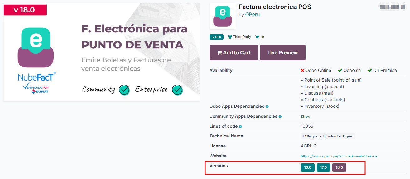 - Módulo l10n_pe_edi_odoofact publicado por OPeru, disponible en el Odoo Apps Store.
