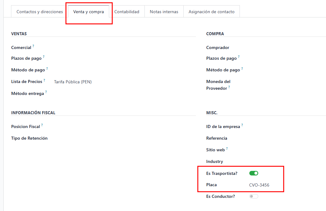 En la pestaña 'Venta y compra' se debe activar el check 'ES TRANSPORTISTA' e ingresa la Placa del vehículo.