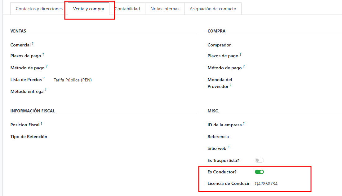 En la pestaña 'Venta y compra' se debe activar el check 'ES CONDUCTOR' e ingresa la Licencia de Conducir del CONDUCTOR.