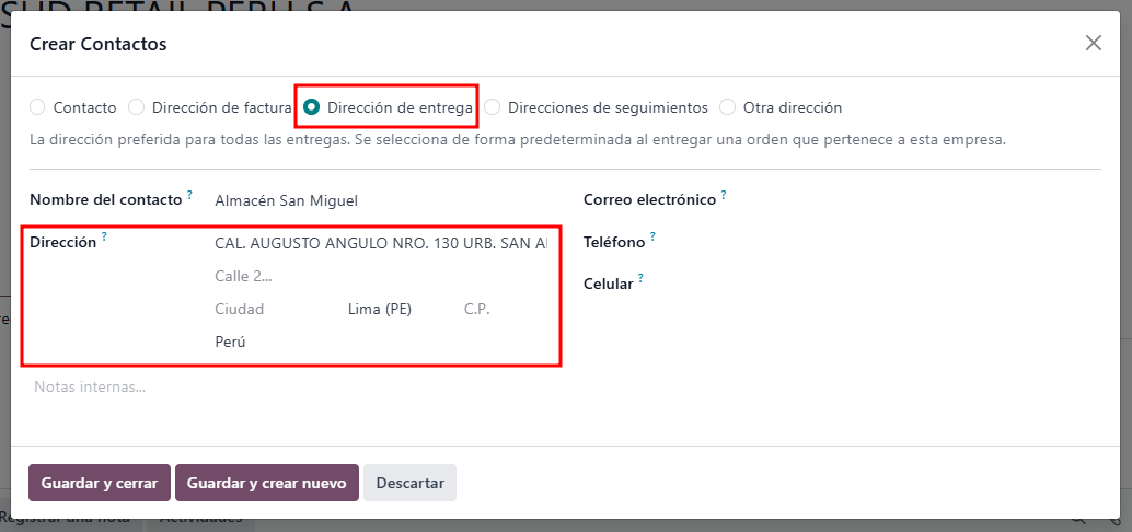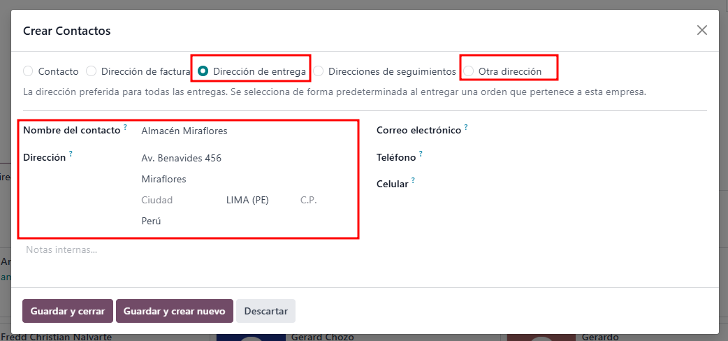 Las direcciones pueden ser de tipo 'Dirección de entrega' u 'Otra dirección'